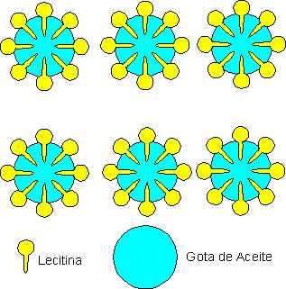 La mayonesa es una emulsión formada al dispersar aceite en un medio acuoso, la yema de huevo, que contiene un emulsionante denominado lecitina. La lecitina rodea a las gotitas de aceite (ver figura) e impide que se unan unas a otras. |